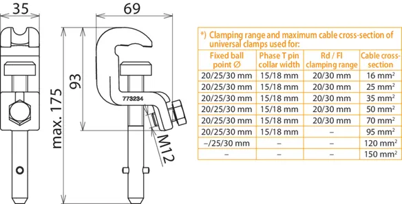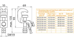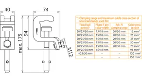 | *) See table for „Clamping range and maximum cable cross-section of universal clamps used for" | |