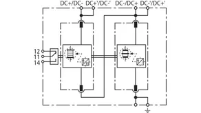 Coordinated and modular two-pole lightning current arrester for DC applications up to 60 V (1+1 configuration); FM version with floating remote signalling contact.