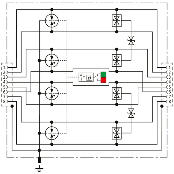 Universal, space-saving combined arrester of 19 mm in width and RJ45 connection system with status indication for simple maintenance. Protection of applications in structured cabling according to class EA to 500 MHz; e.g. industrial Ethernet, data distributors, digital camera systems, Power over Ethernet (IEEE 802.3 compliant to 4PPoE) and Ethernet-based interfaces in general. Protection of all pairs through powerful gas discharge tubes and protective diodes between signal cores and pairs. Fully shielded adapter design with RJ45 sockets for DIN rail mounting. With additional screw connection on the enclosure for an optional earth connection.