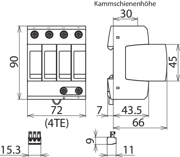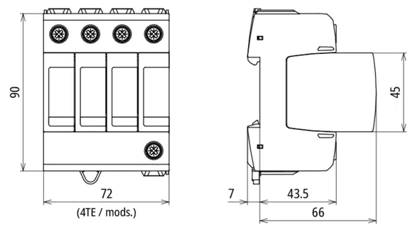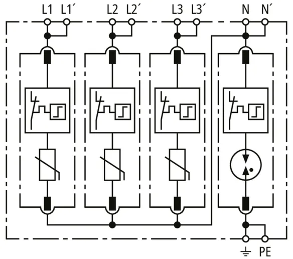 Modular surge arrester for TT and TN-S systems (3+1 configuration); with floating remote signalling contact.
