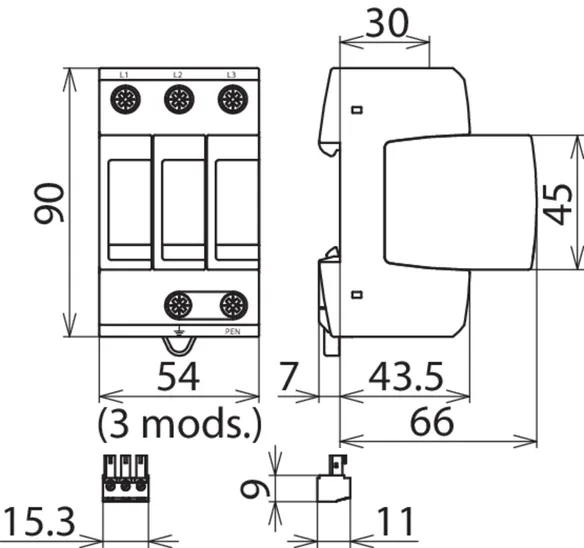 SPD according to EN 61643-11 / IEC 61643-11 Type 2 + Type 3 / class II + class III