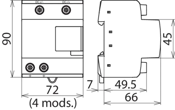 Four-pole surge arrester with IP 65 degree of protection and three-step d.c. switching device for PV inverters for protecting two MPP inputs.