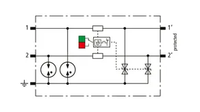 Combined arrester protection module with a width of 6 mm for BLITZDUCTORconnect with status indication for protecting one pair in 24 V DC systems. Also suitable for use with an earthed negative pole. Integrated PTC resistors allow for secure resetting of the arrester after interference in the system circuit with short-circuit currents of up to 40 A.