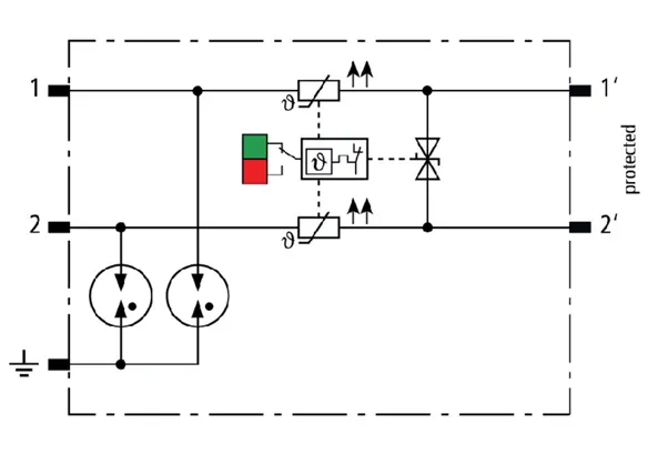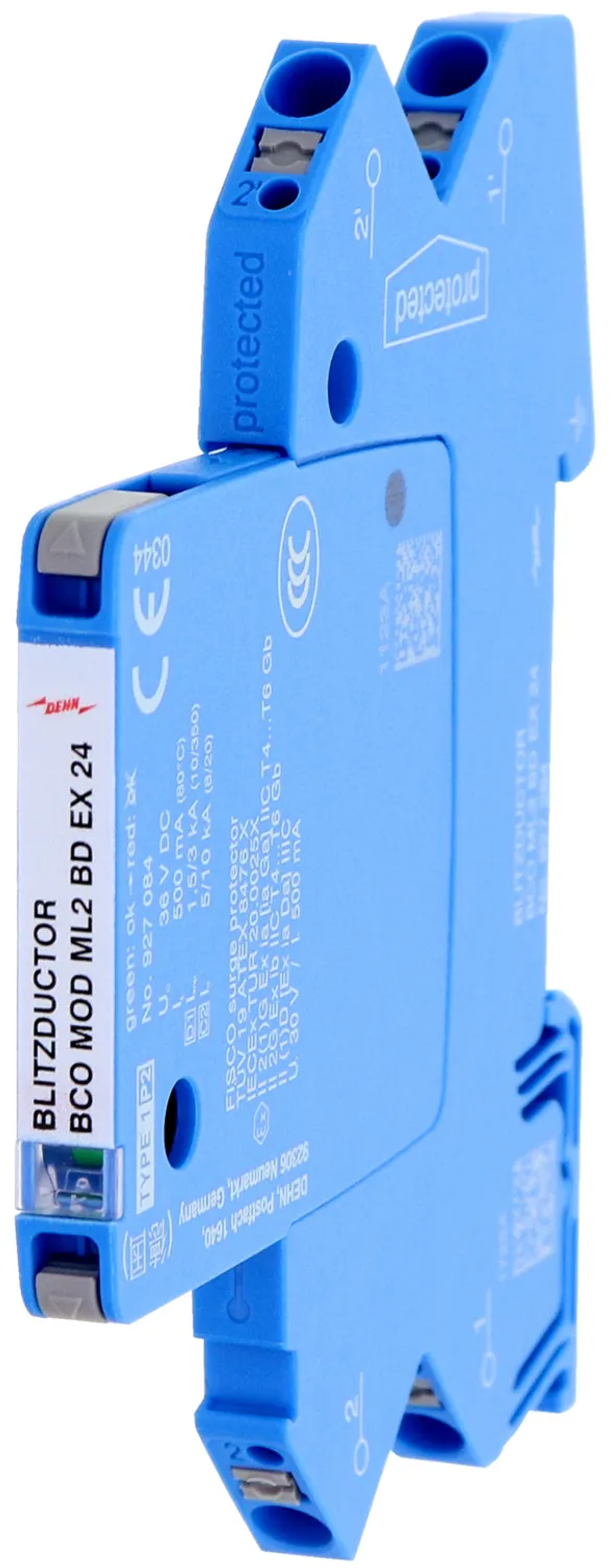 Combined arrester protection module with a width of 6 mm for BLITZDUCTORconnect with status indication for protecting one pair in 24 V DC systems. Also suitable for use with an earthed negative pole. Integrated PTC resistors allow for secure resetting of the arrester after interference in the system circuit with short-circuit currents of up to 40 A.