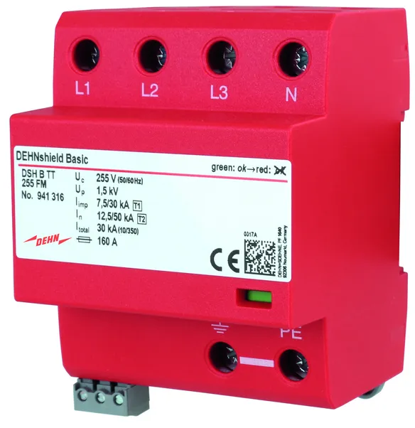 Application-optimised and prewired combined lightning current and surge arrester for TN-S systems for use in the main power supply system (4+0 configuration) in case of residential buildings without external lightning protection system (also in case of buildings supplied by overhead lines); with floating remote signalling contact.