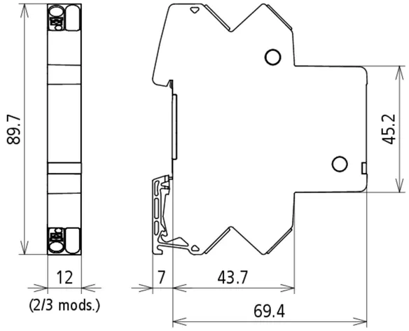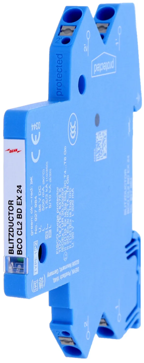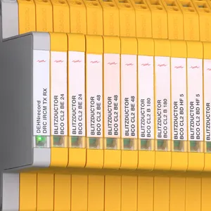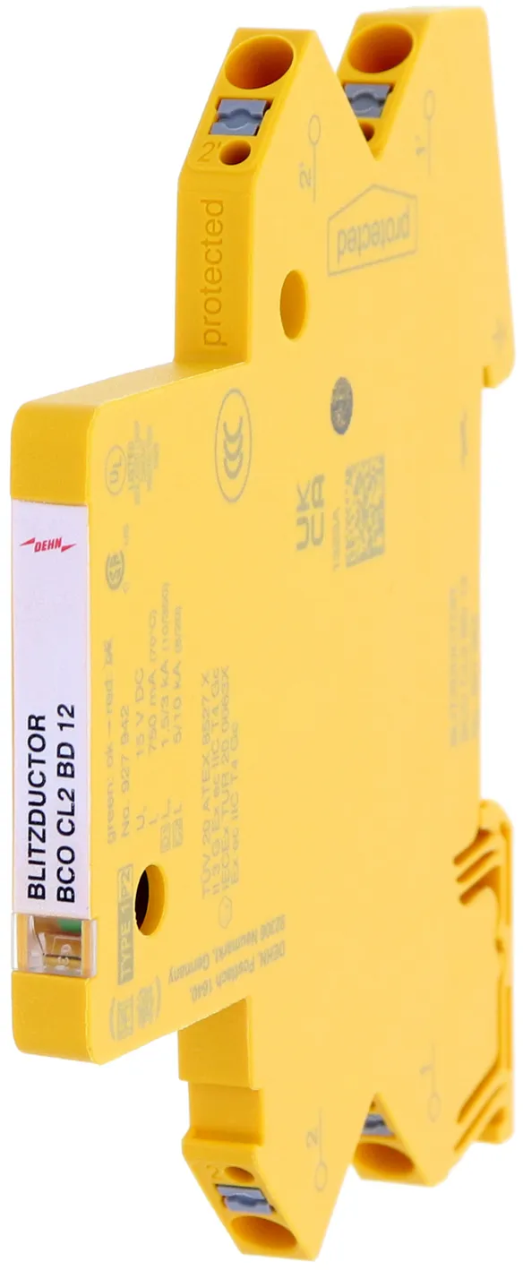 Space-saving, compact surge arrester with a width of 6 mm and push-in connection technology with status indication. Finely limiting, single-stage surge protection with powerful diodes for protecting two single cores sharing a common reference potential as well as unbalanced interfaces.