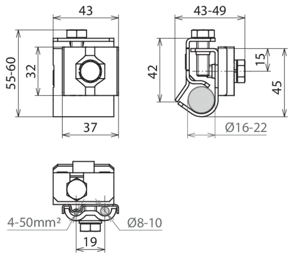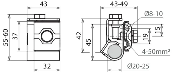 1 conductor Rd Ø10 mm or 1-2 conductors Rd Ø6-8 mm or 4-50 mm2 (solid / stranded).