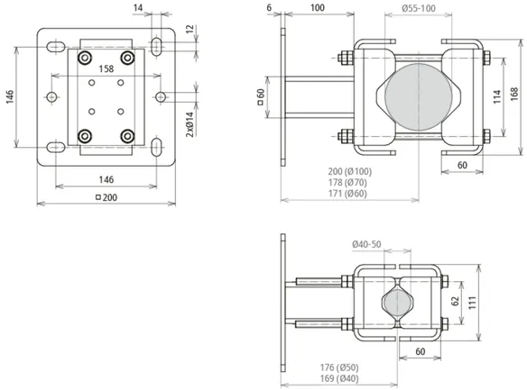 | Clamping range (Ø mast) | 40-50 mm (upright) and 55-100 mm (transverse) |